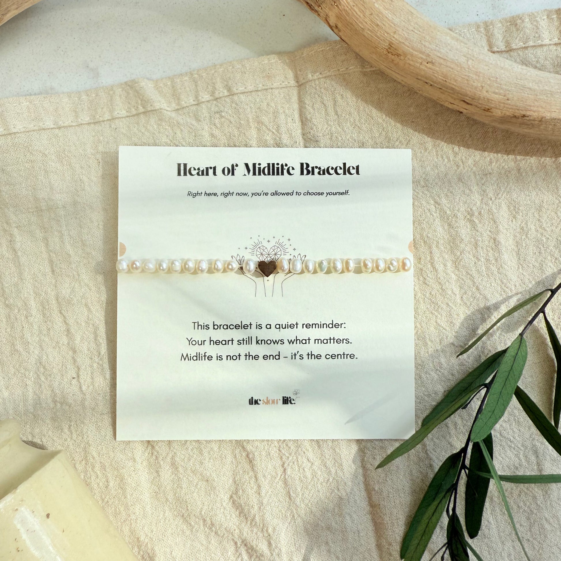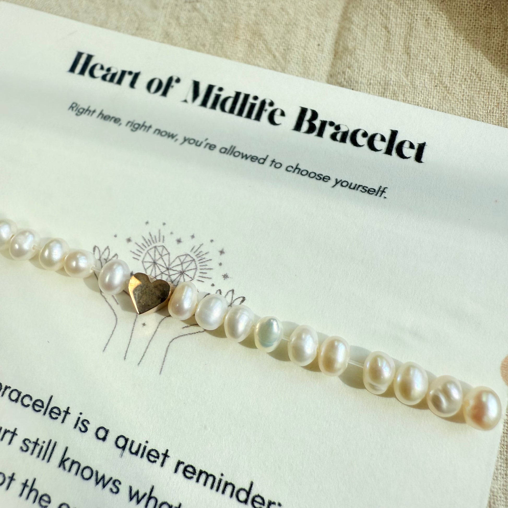 A delicate bracelet made from genuine freshwater pearls, strung on soft elastic and finished with a rose gold-plated heart charm – a quiet symbol of self-love and clarity in the middle of life.