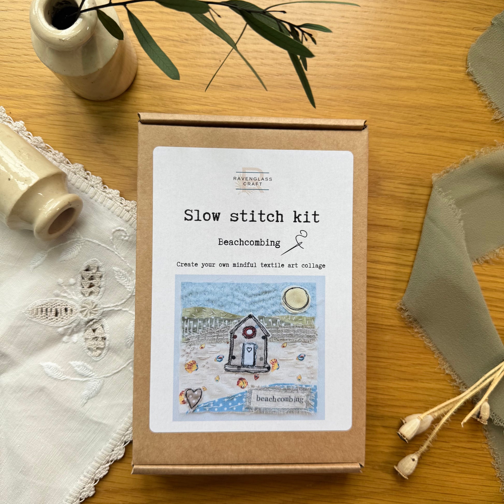 This peaceful hand-sewing kit invites you to create your own little seaside scene, featuring a handmade beach hut motif and a selection of soft-toned fabrics, threads, and treasures.