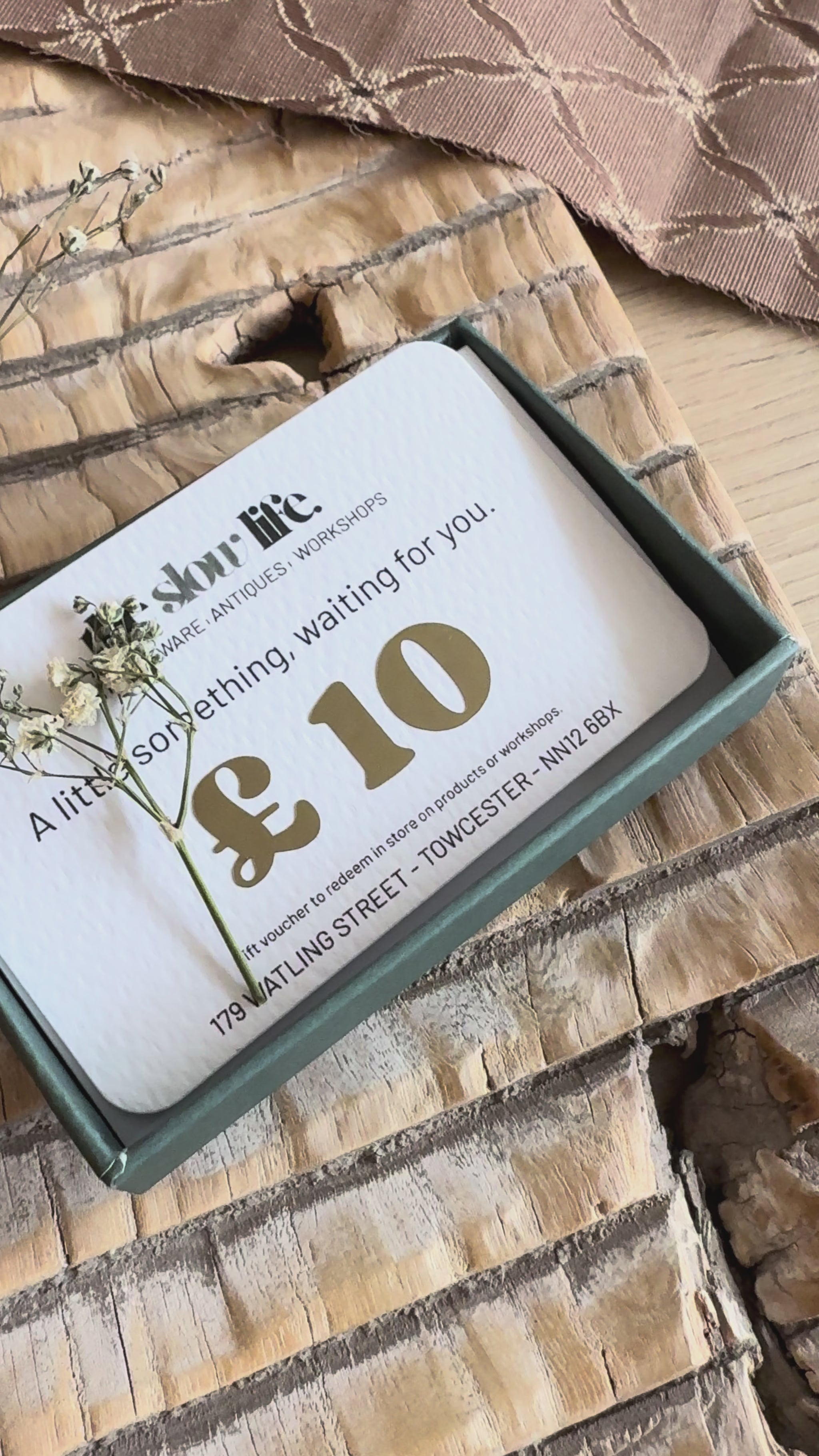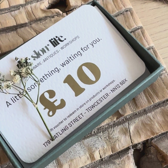 The voucher invites the recipient to visit The Slow Life in Towcester and take their time browsing our curated pieces or booking a creative workshop.
